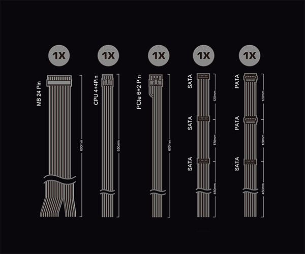80 Plus hatásfok: Gold, ATX szabvány: ATX 3.1, folyamatos 12 V ág terhelhetősége: 54,1 A, garancia: 3 év, méretek: 140 × 150 × 86 mm, hűtés: 120 mm-es ventilátor, védelem: OCP, SCP, OVP, UVP, OTP, OPP, kondenzátorok: teljes egészében tajvani, MTBF: 100 000 óra (25 °C), kábelezés: lapos kábelek, alaplapi csatlakozó: 1× 24 pin, CPU EPS csatlakozó: 1× 4+4 pin, PCIe 5.1 csatlakozó: nincs, PCIe csatlakozó: 1× 6+2 pin, periféria csatlakozók: 2× 4 pin, SATA csatlakozók: 4 db.