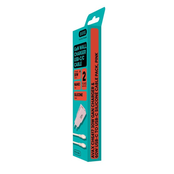 Az AVAX CH6417 csomag praktikus és teljes körű megoldást kínál a modern töltési igényekhez. A csomag 30W GaN gyorstöltőt és 60W USB-C szilikon kábelt (1,5 m) tartalmaz, így ideális választás otthoni, irodai vagy utazás közbeni használatra.