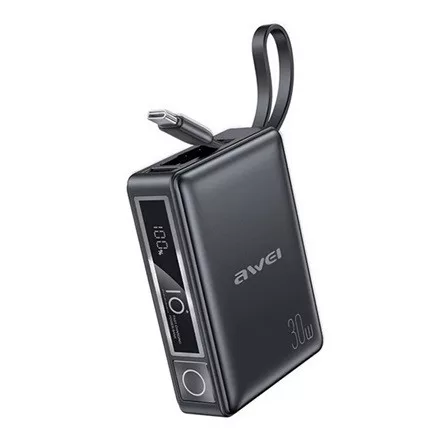 AWEI P87K vésztöltő USB+Type-C aljzat (10000mAh, 30W, PD gyorstöltő + fix Type-C kábel) FEKETE