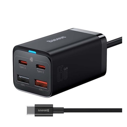 BASEUS hálózati töltő 2 USB+2 Type-C aljzat 65W, PD gyorstöltő 4.0 + Type-C - Type-C kábel, FEKETE