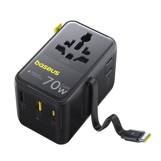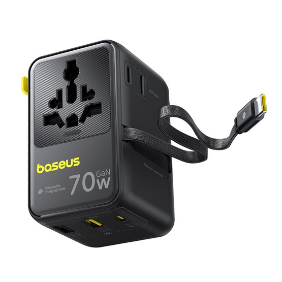 Baseus EnerCore CG11 töltőállomás, 70W, 1×AC + 2×USB Type-A + 1×USB Type-C + 1×USB Type-C automata behúzós kábel, fekete