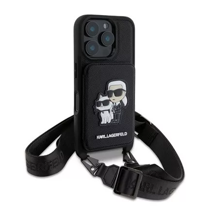 iPhone 16 Pro KARL LAGERFELD SAFFIANO CROSSBODY STRAP szilikon telefonvédő ütésállóság, kártyatartó, FEKETE