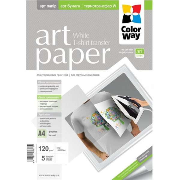 COLORWAY Fotópapír, pólóra vasalható (ART T-shirt transfer, white), 120 g/m2, A4, 5 lap