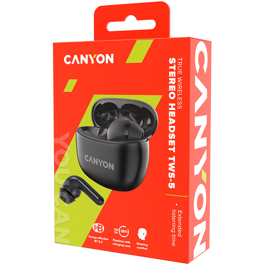 Megj.: Canyon TWS-5 Bluetooth headset, with microphone, BT V5.3 JL 6983D4, Frequence Response:20Hz-20kHz, battery EarBud 40mAh*2+Charging Case 500mAh, type-C cable length 0.24m, size: 58.5*52.91*25.5mm, 0.036kg, Black