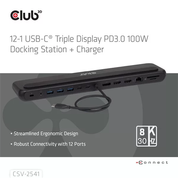 Club 3D Notebook Dokkoló - CSV-2541 (USB-C to 4xUSB-C, 2xUSB-A, 2xHDMI, 2xDP, RJ45, SD/MicroSD, 100W PD, 4K60hz)