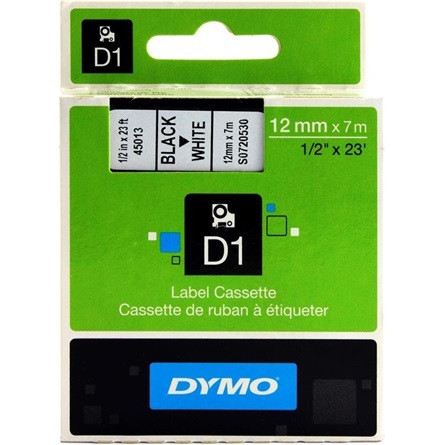 **DYMO D1 45013 f.szalag 12mm x 7m fehér-fekete** * Minden feliratozási igénynek megfelel irodai környezetben, műhelyben vagy kiskereskedelmi egységekben. Ezek a szalagok tartós, jó minőségű feliratozást tesznek lehetővé. * Fehér alapon Fekete betű * Standard méret és ragasztóanyag * Beltérre és/vagy sík felületre * Használható; LM 210, LM 160, LM 360D, LM 280, LM 420P, LM PnP, LM PnP wifi, MobileLabeler, LM 500TS, Rhino 4200 Rhino 5200 és a LabelWriter Duo nyomtatókoz