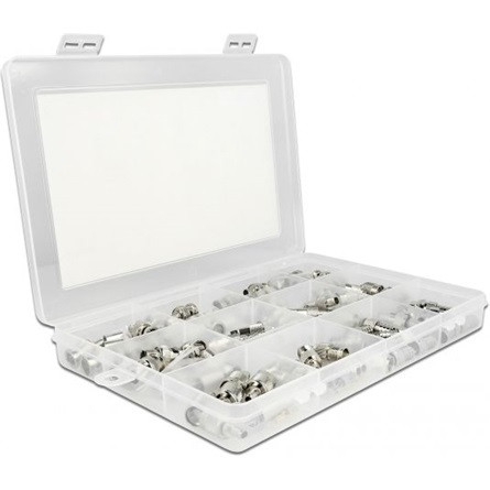 Delock 70 darabos krimp doboz 75 Ohm BNC, TNC és F csatlakozókkal
