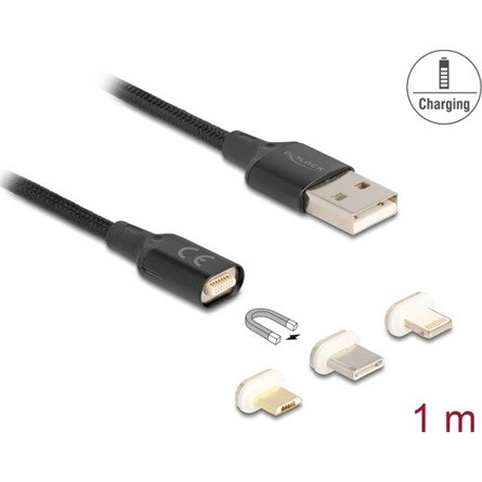 Delock Mágneses USB töltő készlet 8 tűs Lightning  / Micro USB / USB Type-C  csatlakozókkal, fekete 1 m