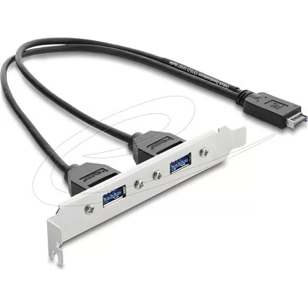 Ez a Delock USB-kábel lehetővé teszi két külső USB 5 Gbps eszköz csatlakoztatását az alaplapon található belső USB E típusú A kulcsos csatlakozón keresztül. A két USB A-típusú aljzat egy rekeszrögzítőre szerelhető, amely könnyedén behelyezhető a számítógépház egy szabad PCIe bővítőhelyére ideális megoldás a számítógép hátoldali USB csatlakozóinak bővítésére.