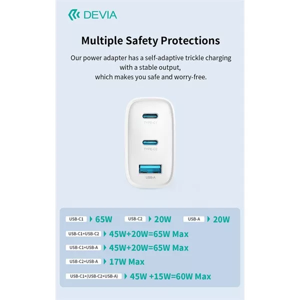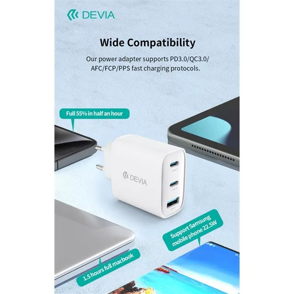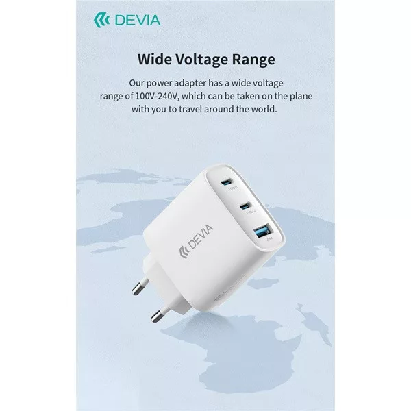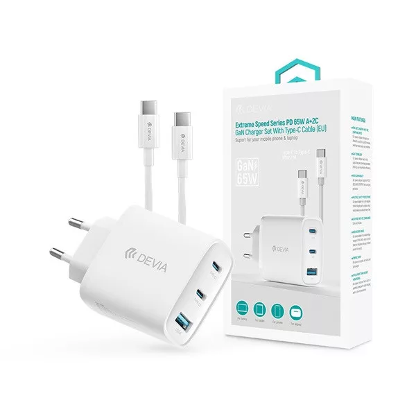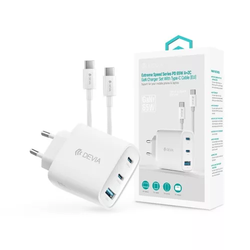 Devia Extreme Speed Series 65W GaN PD hálózati gyorstöltő adapter, USB+2x USB-C, Type-C kábel, fehér