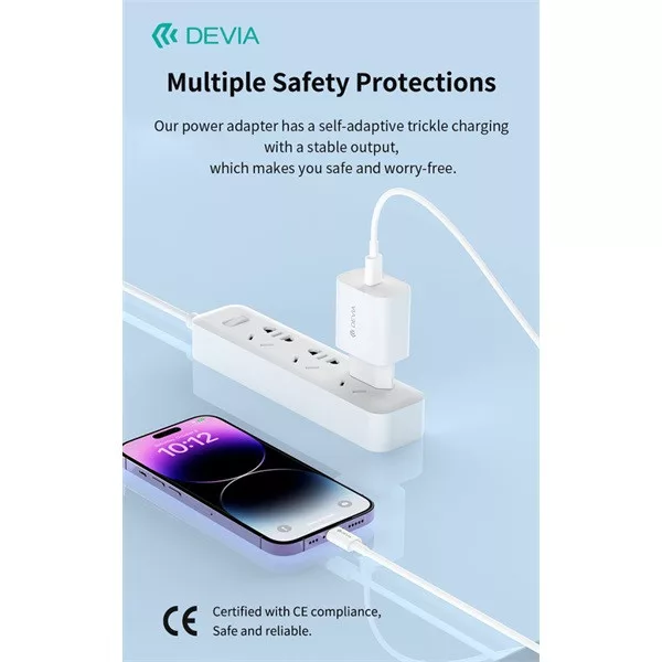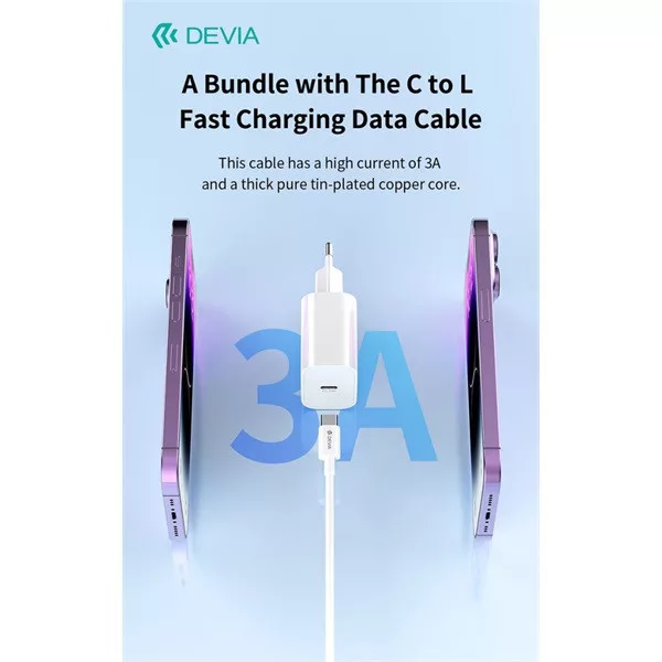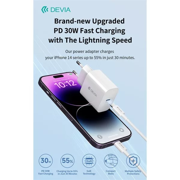 Devia Smart Series 30W GaN PD+QC hálózati gyorstöltő adapter + Type-C/Lightning kábel - fehér