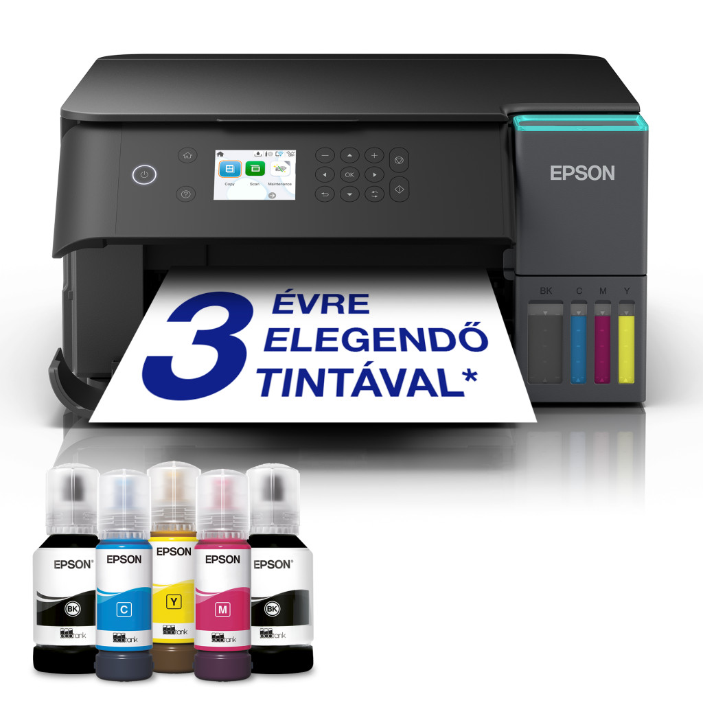 EcoTank L6360, Tintasugaras nyomtatók, Fogyasztói/Többfunkciós/Tintatartály-rendszer/Otthoni, Letter, 4 tinta, KCYM, Nyomtatás, Szkennelés, Másolás, Igen (A4, normál papír), 4 800 × 1 200 DPI, 35 oldal/perc Fekete-fehér (normál papír 75 g/m²), 23 oldal/perc Színes (normál papír 75 g/m²), 250 lap Alap, 1 200 DPI × 2 400 DPI (vízszintes × függőleges), 30 oldal, Panel: Típus: Színes, Átló: 6,1 cm, USB, Ethernet, Wi-Fi Direct, Vezeték nélküli LAN IEEE 802.11a/b/g/n/ac, Mac OS X 10.9.5 vagy újabb, Windows 10 (32/64 bit), Windows 11, Windows 7 (32/64 bit), Windows 8 (32/64 bit), Windows 8.1 (32/64 bit), Windows Server 2008 (32/64 bit), Windows Server 2008 R2, Windows Server 2012 (64 bit), Windows Server 2012 R2, Windows Server 2016, Windows Server 2019, Windows Server 2022, 1 készlet tinta (1× 127 ml BK, 3× 70 ml CMY) + Extra fekete, Főegység, Tápkábel, Gyors telepítési útmutató, Garanciajegy