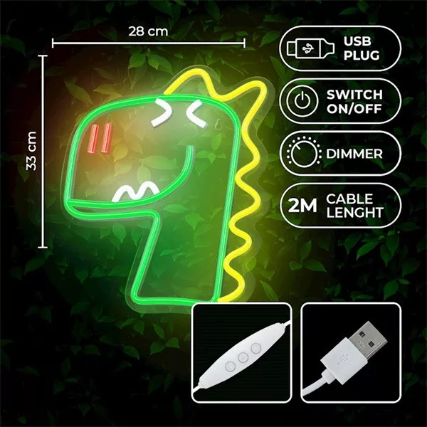 FOREVER LIGHT Neon LED dekorációs lámpa JURASSIC DINO zöld, szabályozható, USB, be/ki kapcsoló, falra szerelhető