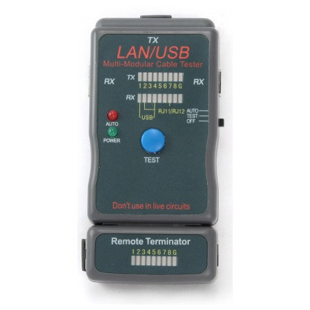 Tests: USB (A/A), USB (A/B), 100Base-TX, 1000Base-TX, Token Ring, EIA/TIA568A/568B and RJ11/RJ12 modular cables