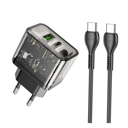 HOCO N34 hálózati töltő USB+Type-C aljzat 20W, PD gyorstöltő 3.0 + Type-C kábel, ÁTLÁTSZÓ