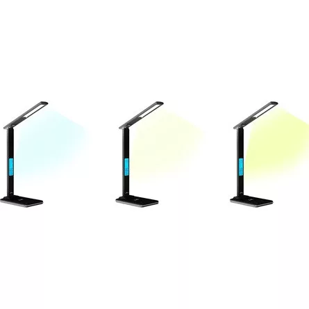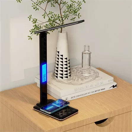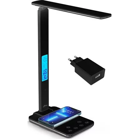 Energiatakarékos LED asztali lámpa 15 W-os induktív töltővel. Megvilágított ébresztőóra C/ F hőmérővel.