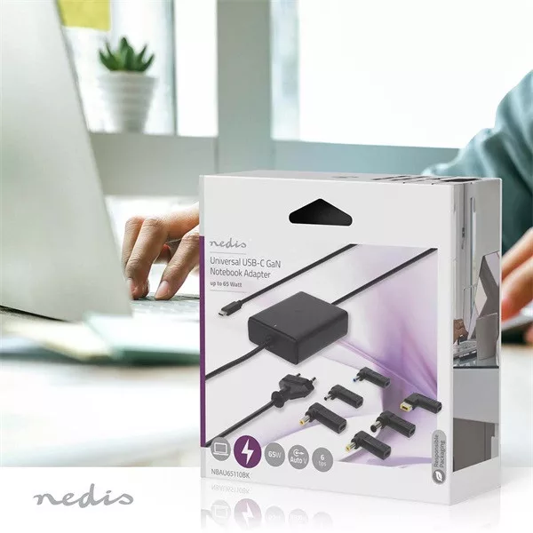 Nedis NBAU65110BK univerzális notebook / telefon / tablet töltő 65 W, GAN, 5 / 9 / 12 / 15 / 20 V DC, 2,4 / 3,0 / 3,25A