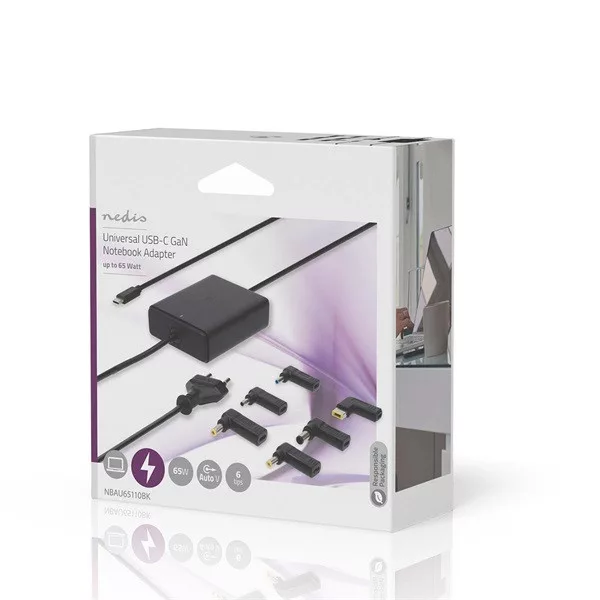 Nedis NBAU65110BK univerzális notebook / telefon / tablet töltő 65 W, GAN, 5 / 9 / 12 / 15 / 20 V DC, 2,4 / 3,0 /  3,25A