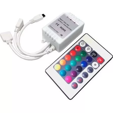 Infravörös működésű, távirányítós vezérlő színváltós RGB led szalaghoz, 24 gombos tasztatúrás távirányítóval. A vezérlő lehetővé teszi, hogy fel vagy le kapcsoljuk a fényt, csökkentsük vagy növeljük a fény erejét, vagy megváltoztassuk annak színét. A vezérlő szetthez tartozó távirányítóval akár 16 különböző színt (3 alapszín és 13 szín, amely az alapszínek keveréke) lehet beállítani, illetve 4 programot a szín megváltoztatásához.