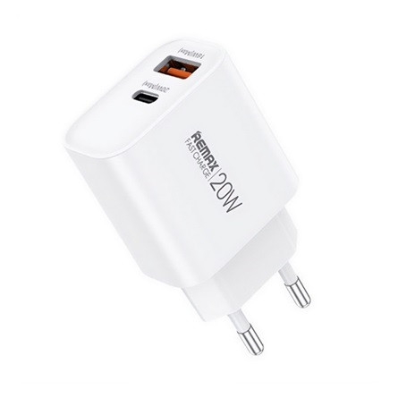 REMAX KIDDY hálózati töltő USB+Type-C aljzat (20W, PD gyorstöltő) FEHÉR