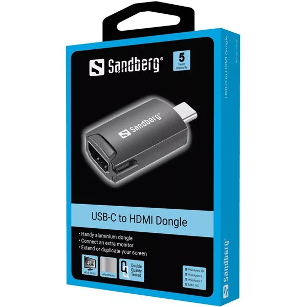 Sandberg USB-C to HDMI Dongle. Maximális felbontás (HDMI): 3840 x 2160 pixelek. Termék színe: Fekete, Készülékház anyaga: Alumínium. Csomagolás szélessége: 80 mm, Csomagolás mélysége: 16 mm, Csomagolás magassága: 120 mm. Mennyiség csomagonként: 1 db