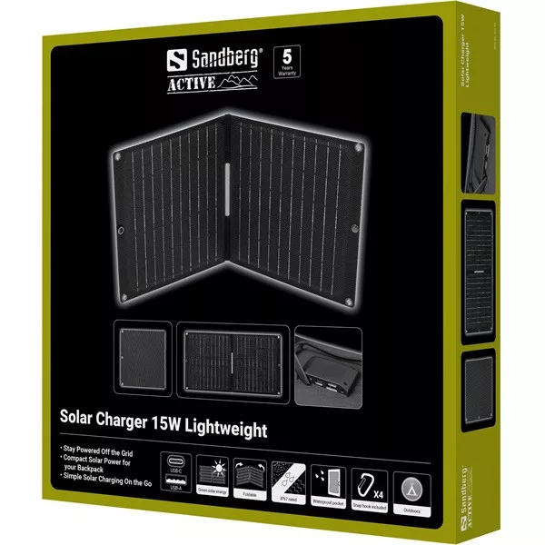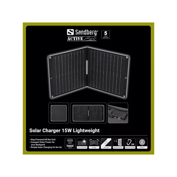 A Sandberg Solar Charger 15W Lightweight praktikus áramforrást biztosít, amikor úton vagy, és szeretnél kevésbé függni a konnektoroktól. A kompakt és összecsukható napelem könnyen elfér a hátizsákodban, és alkalmas szabadtéri használatra, például túrázásra, kempingezésre és fesztiválokra. A hatékony monokristályos napelemek akár 15W teljesítményt is biztosítanak, lehetővé téve, hogy közvetlenül USB-A vagy USB-C csatlakozón keresztül töltsd fel okostelefonjaidat, power bankjaidat és más USB-eszközeidet. A tartós ETFE bevonat magas hatékonyságot és hosszú élettartamot biztosít, még nehéz körülmények között is. Könnyű kialakításával, praktikus tárolózsebével és vízálló szerkezetével a Sandberg Solar Charger 15W Lightweight remek választás, ha útközben van szükséged áramra.