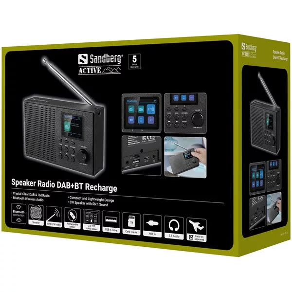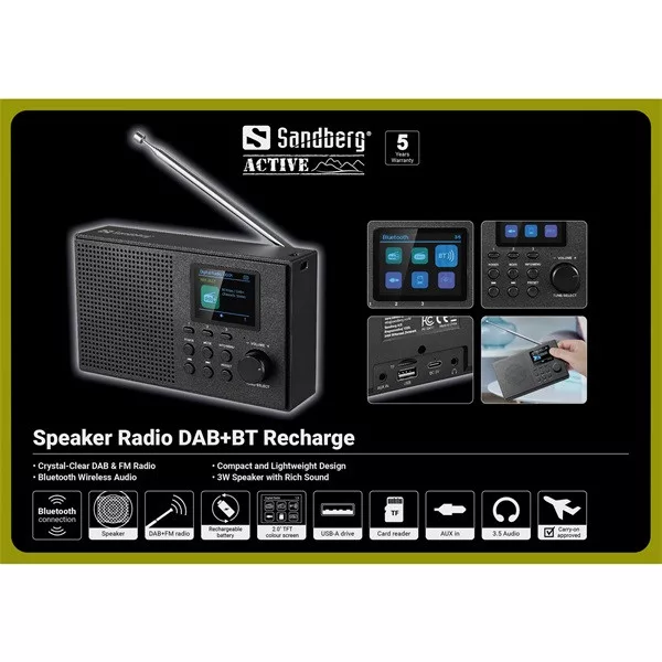 A Sandberg Speaker Radio DAB+BT Recharge kristálytiszta DAB+ és FM vételt biztosít, így a hírek, zene és szórakozás mindig kéznél van. A TFT színes kijelző megkönnyíti az állomások váltását és az összes funkció vezérlését. Használhatod otthon, munkahelyen, a konyhában vagy nyaraláskor – a tölthető akkumulátor szabadságot ad, hogy bárhová magaddal vidd a rádiót. Zenét is streamelhetsz Bluetooth, USB vagy TF kártya segítségével.