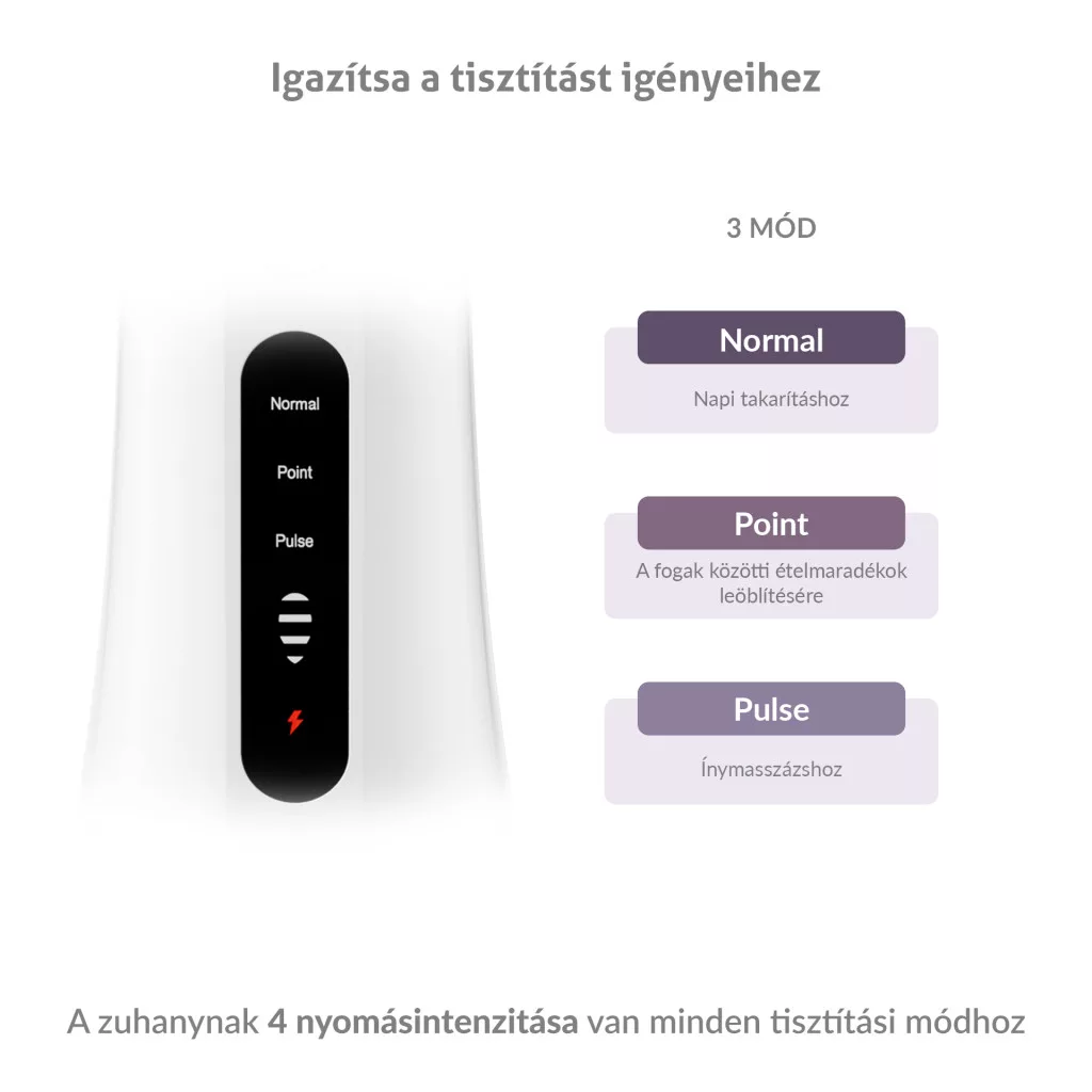 Orális zuhany a fogak közötti gyengéd tisztításhoz, 3 tisztítási mód, 300 ml-es tartály, rendkívül gyors feltöltés felülről és oldalról, újratölthető - 14 nap egy töltéssel, kompakt kialakítás, kijelző, memória, időzítő, 6 fúvóka a csomagban, IPX7 védelem