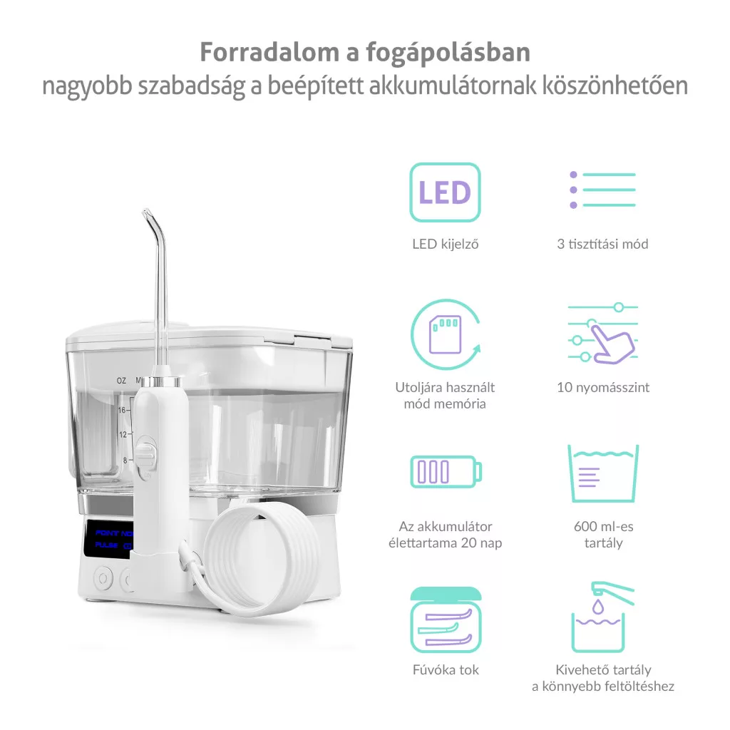 TrueLife AquaFloss Station F300 szájöblítő, 20 napos akkumulátor-üzemidővel újratölthető, 3 üzemmód, 10 nyomásintenzitás, 600 ml-es tartály, 6 fúvóka a csomagban, könnyen összecsukható, StreamTrue® technológia, PulseTrue® technológia, kijelző, memória, időzítő , 360°-ban forgatható fej
