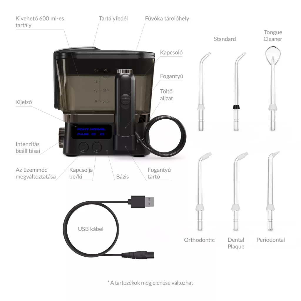 TrueLife AquaFloss Station F300 szájöblítő, 20 napos akkumulátor-üzemidővel újratölthető, 3 üzemmód, 10 nyomásintenzitás, 600 ml-es tartály, 6 fúvóka a csomagban, könnyen összecsukható, StreamTrue® technológia, PulseTrue® technológia, kijelző, memória, időzítő , 360°-ban forgatható fej