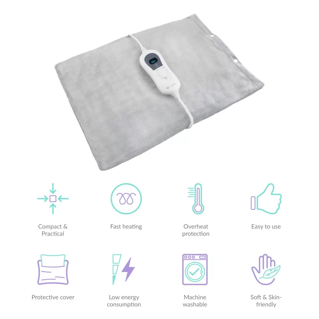 Kompakt fűtőtakaró, 40 x 30 cm, védőhuzat a csomagolásban, 3 hőmérséklet szint, automatikus kikapcsolási funkció, 3,3 m hosszú tápkábel, gyors és egyenletes fűtés, túlmelegedés elleni védelem, alacsony áramfogyasztás, mosógépben is mosható, egyszerű kezelés, utazásra alkalmas, segít enyhíteni a hát- és ízületi fájdalmakat.