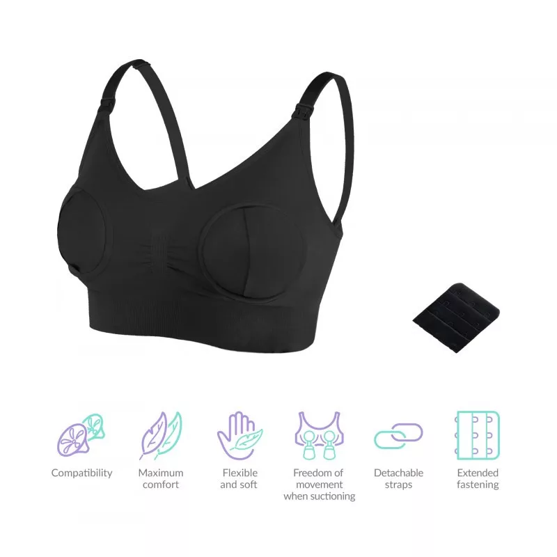 Speciális szoptatós melltartó mellszívórögzítő mechanizmussal. TrueLife és más a piacon kapható mellszívókkal kompatibilis. Anyaga: nylon, spandex, sztreccs, 4 méret, színe: fekete, a bővítő toldat a csomagolás része.