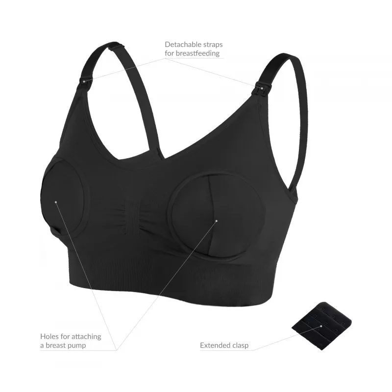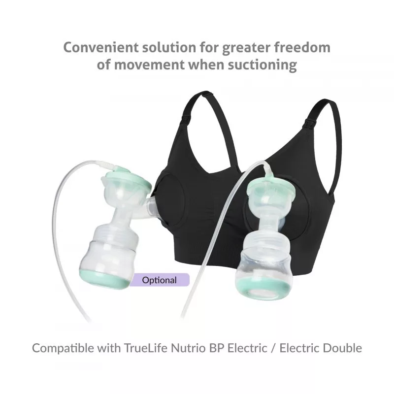 Speciális szoptatós melltartó mellszívórögzítő mechanizmussal. TrueLife és más a piacon kapható mellszívókkal kompatibilis. Anyaga: nylon, spandex, sztreccs, 4 méret, színe: fekete, a bővítő toldat a csomagolás része.