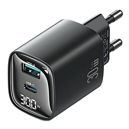 USAMS CC229 hálózati töltő USB+Type-C aljzat 30W, LED kijelző, FEKETE