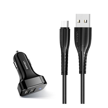 USAMS KING-TU autós töltő 2 USB aljzat 10W + Type-C kábel FEKETE