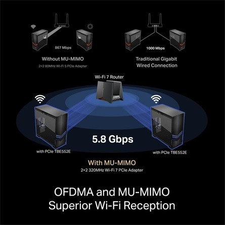 TP-Link Archer TBE552E. Kapcsolódási technológia: Vezeték nélküli, Host csatlakozófelület: PCI Express, Csatlakozófelület: WLAN / Bluetooth. Maximális adatátviteli sebesség: 5760 Mbit/s, A legfontosabb Wi-Fi szabvány: Wi-Fi 7 (802.11be), Wi-Fi sáv: Háromsávos (2,4 GHz / 5 GHz / 6 GHz). Antenna típusa: 2x2