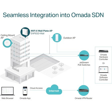 TP-Link Omada EAP650-Wall. 2.4 GHz, 5 GHz, Maximális adatátviteli sebesség: 3000 Mbit/s. Biztonsági algoritmusok: SNMP, SSH, WPA-Enterprise, WPA2-Enterprise. Ethernet LAN adatátviteli sebességek: 10,100,1000 Mbit/s. Ethernet-áramellátás (PoE) támogatása. Termék színe: Fehér