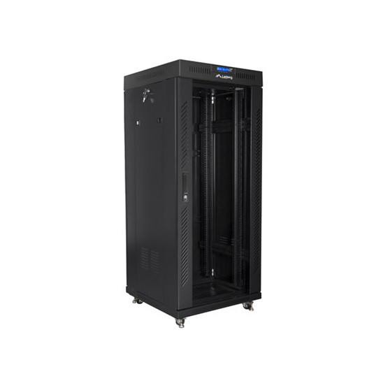Lanberg 19" szabadon álló rack szekrény 27U/600X600 üvegajtó, lapraszerelt, LCD kijelző, fekete V2