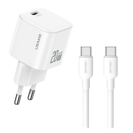 USAMS JO hálózati töltő Type-C aljzat 20W, PD gyorstöltő + Type-C kábel, FEHÉR