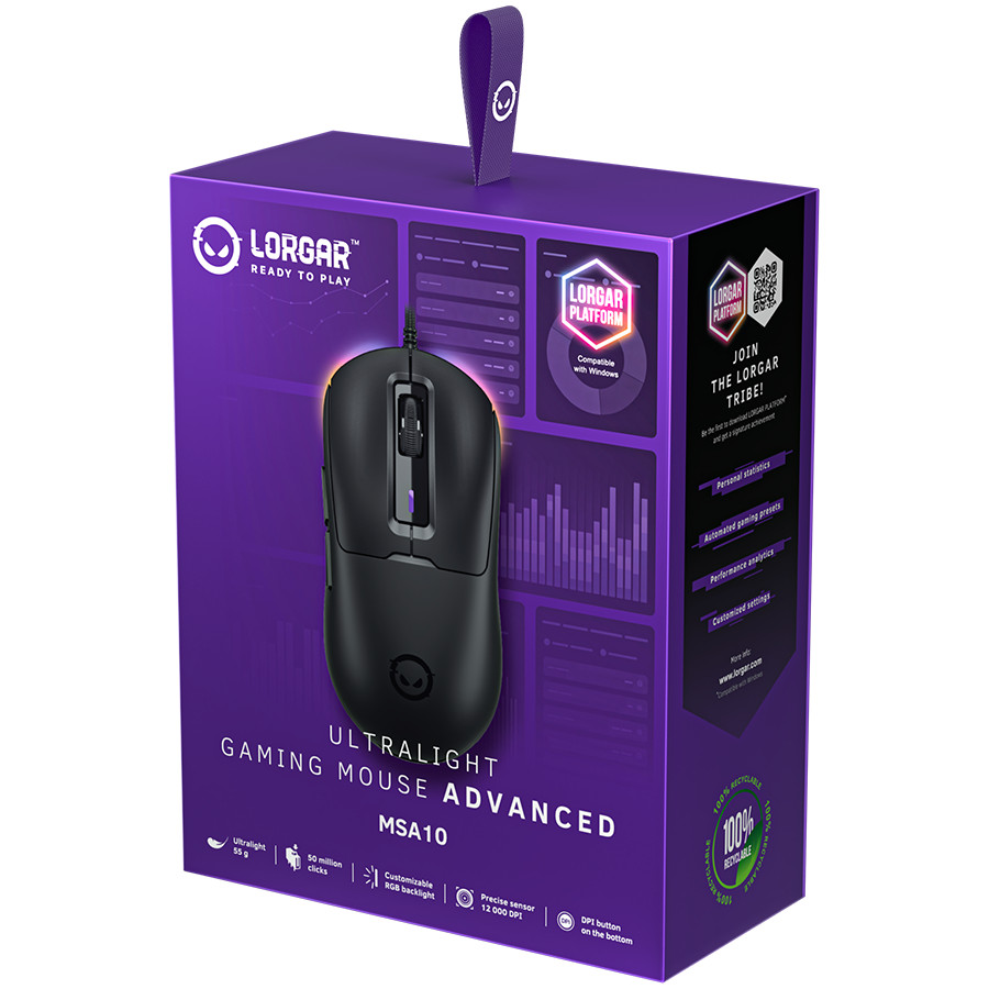 Marketingmodell neve: MSA10 | Kereskedelmi név: Ultralight Gaming Mouse Advanced MSA10 Black (LRG-MSA10-BK) | Szoftver: LORGAR PLATFORM | Eszköz helye: Külső | Csatlakozási technológia: Vezetékes | Felület: USB | Gombok száma: 6 | Gomb funkció: Programozható | Gomb élettartama: 50 000 000 clicks | Egér érzékelő: PixArt PAW3311DB | Mozgásfelbontás: 12000 pont per hüvelyk | Max&Min mozgásfelbontás: 100 pont per hüvelyk
