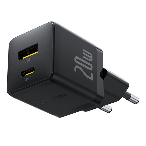 Baseus Palm hálózati gyorstöltő 20W, USB Type-C + USB Type-A, fekete