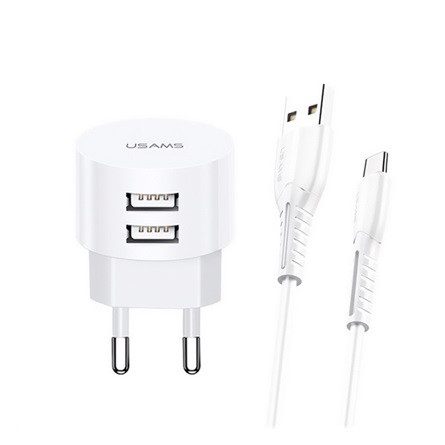 USAMS T20 hálózati töltő 2 USB aljzat 10W, gyorstöltő + Type-C kábel, FEHÉR